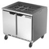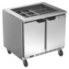 Salad Top Refrigerated Counter, two-section, 36″W, 10.01 cu. ft., (2) solid hinged doors, stainless steel top, includes 1/3 size pans (pans furnished are 4″ deep, tops will accommodate 6″ deep pans), lift-off lid, (4) epoxy-coated wire shelves, stainless steel front, sides, doors & grille, galvanized steel back & bottom, aluminum interior, rear-mounted self-contained refrigeration, 6″ casters (2 with brakes), R290 Hydrocarbon refrigerant, 1/6 HP, cULus, UL EPH Classified, UL-Sanitation, Made in USA