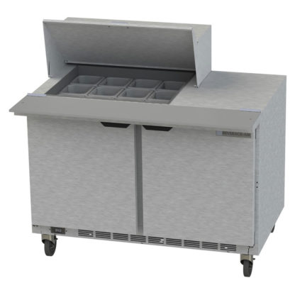 The cabinet has epoxy-coated shelves to hold product, and the two stainless steel doors close by themselves to keep cold air inside. To make it easy to unload or load the cabinet, the doors have a stay-open feature when opened past 120 degrees. The Beverage Air SPE48HC-12M Elite Series prep table has an aluminum interior construction that resists corrosion.