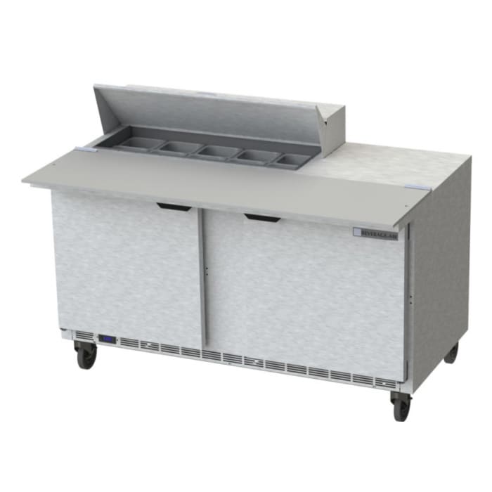 The Beverage Air SPE60HC-10C prep table has a countertop that can be used to prep sandwiches, salads, pizzas, wraps, and more. Toppings for these dishes sit in 10 polycarbonate, sixth-size pans in a cutout that is protected by a stainless steel lid. A forced air system ensures cold air is pushed around the pans to keep toppings in the safe temperature zone. The exterior of the unit is constructed of stainless steel and galvanized steel for strength.
