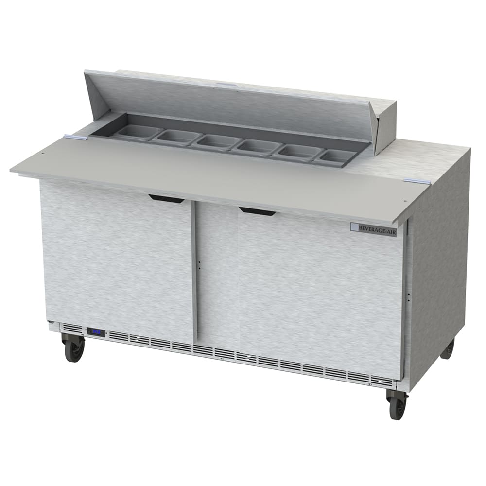 The top of the Beverage Air SPE60HC-12C prep table has a 17-inch cutting board that can be used to prepare toppings that will be stored in the 12 polycarbonate pans in the cutout. These products are protected from contaminants with the stainless steel lid and hood, while a forced air system pushes air under the pans to ensure product stays chilled.
