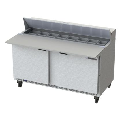 The Beverage Air SPE60HC-16C Elite Series prep table comes with 16 sixth-size, 4-inch pans. Product from the pans is cooled by forced air from the evaporator and can be prepped on the 17-inch-deep cutting board. In the refrigerated base, four epoxy-coated shelves hold additional product, and the liner is made of corrosion-resistant aluminum. Users can easily access the product through the removable doors, which have a self-closing design for cold air retention. Their 120-degree stay-open design provides convenience when users load product into the base section. This Beverage Air SPE60HC-16C prep table has four 6-inch casters, two of which have brakes to stabilize the unit.