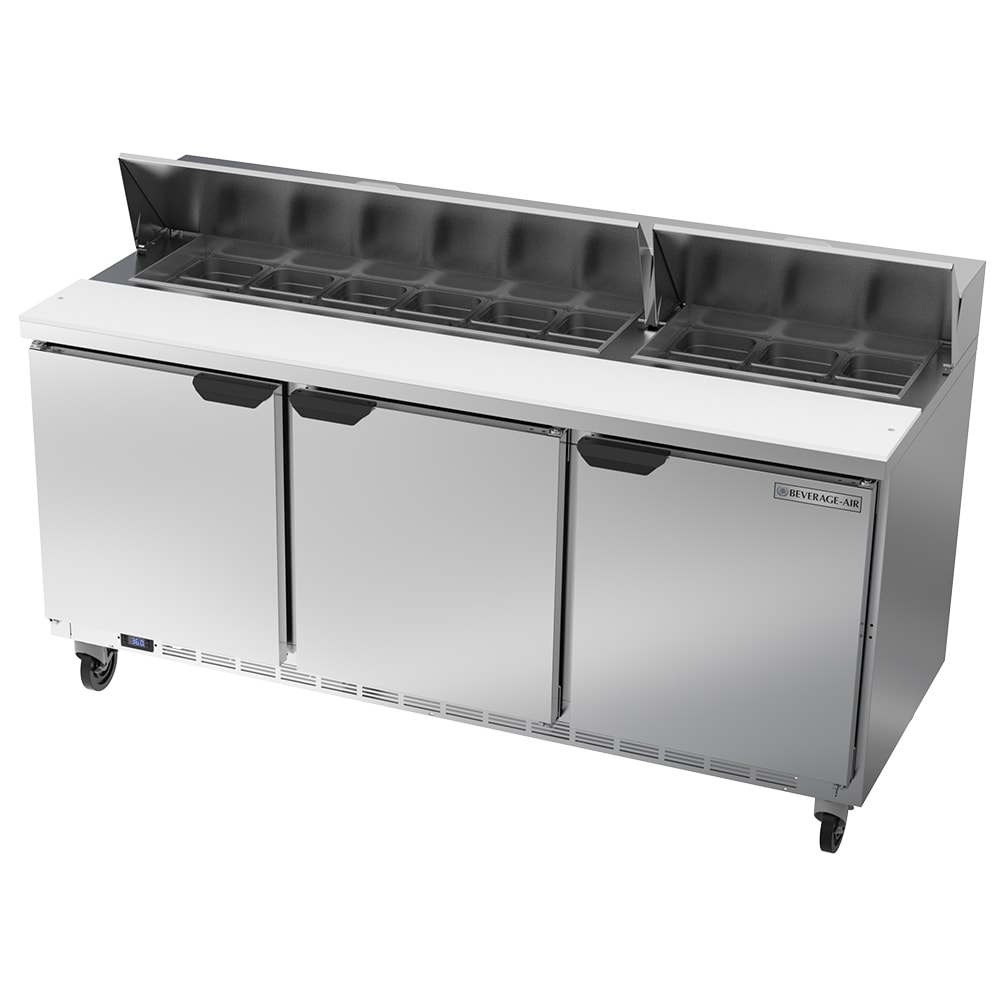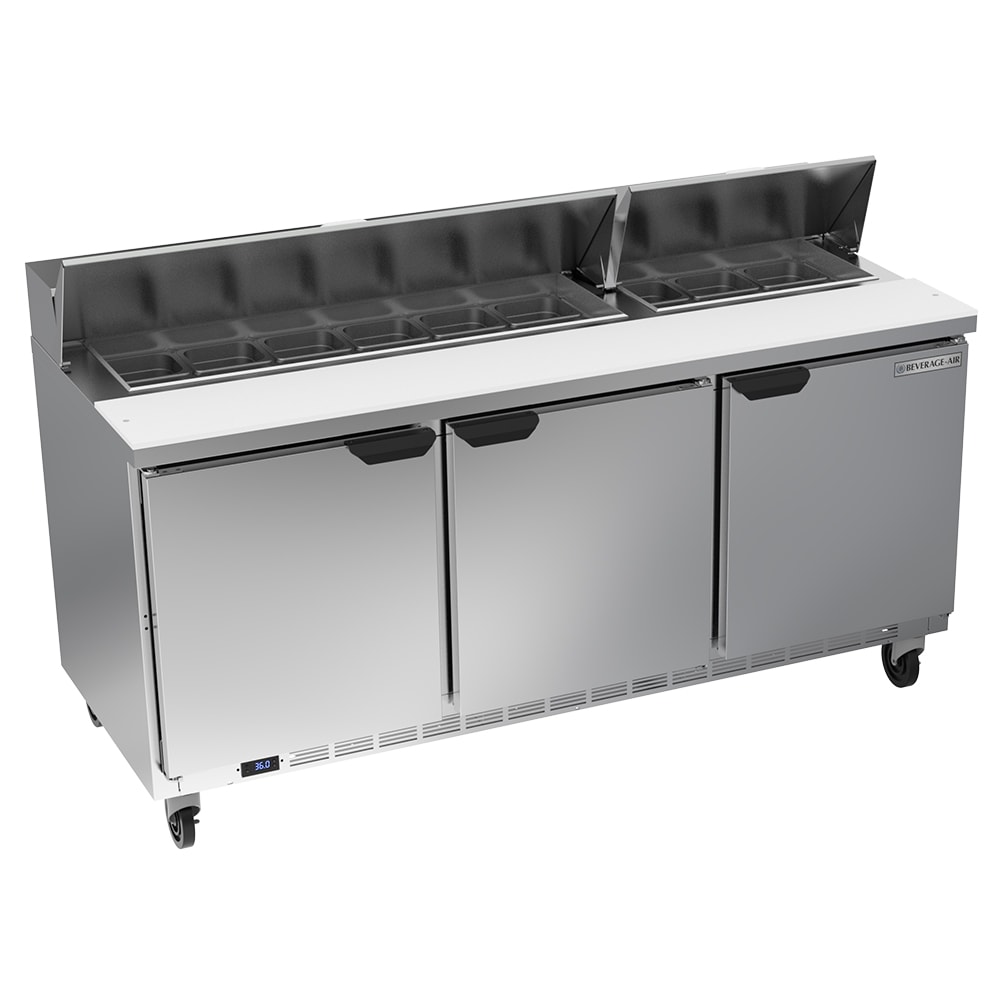 The Beverage Air SPE72HC-18 prep table holds ingredients for salads, sandwiches, and more in 18 sixth-size, 4-inch-deep pans. Product temperature is kept above freezing and below 41 degrees Fahrenheit by forced air moving cold air around the pans. Pans in the compartment are recessed 2 inches in the countertop to maintain cold temperatures. Its removable lid assemblies insulate the pan compartment while keeping contaminants out. A 10-inch-deep cutting board on the front provides a convenient prep space.