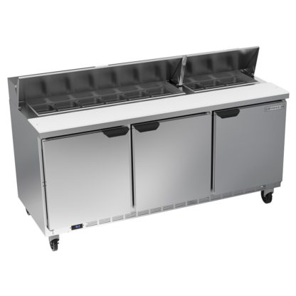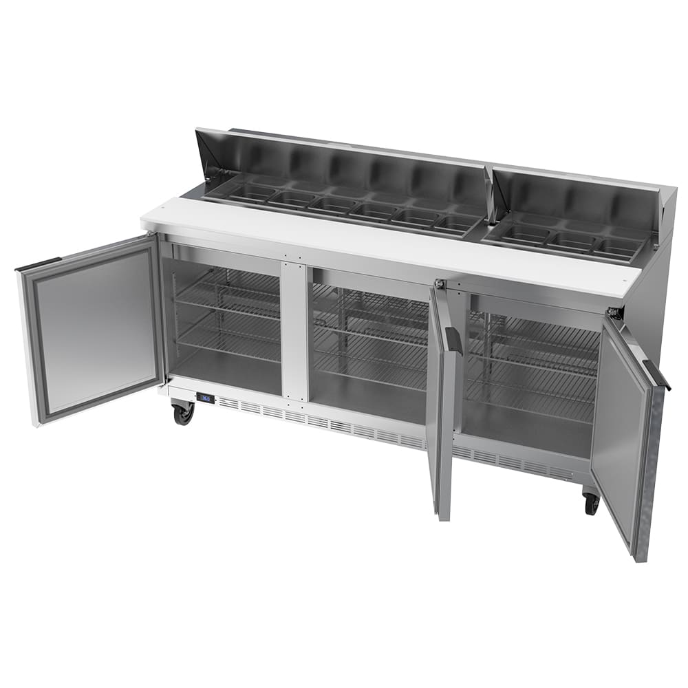Elite Series Sandwich Top Refrigerated Counter, three-section, 72″W, 21.5 cu. ft. capacity, (3) doors, stainless steel top with opening for (18) 1/6 size pans, 10″ cutting board, (6) shelves, stainless steel exterior top, front, sides & doors, galvanized steel exterior bottom and back, aluminum interior, rear-mounted self-contained refrigeration, (pans furnished are 4″ deep, tops will accommodate 6″ deep pans), R290 Hydrocarbon refrigerant, 1/3 HP, UL, cULus, UL EPH Classified, UL-Sanitation, MADE IN USA, 115v/60/1ph