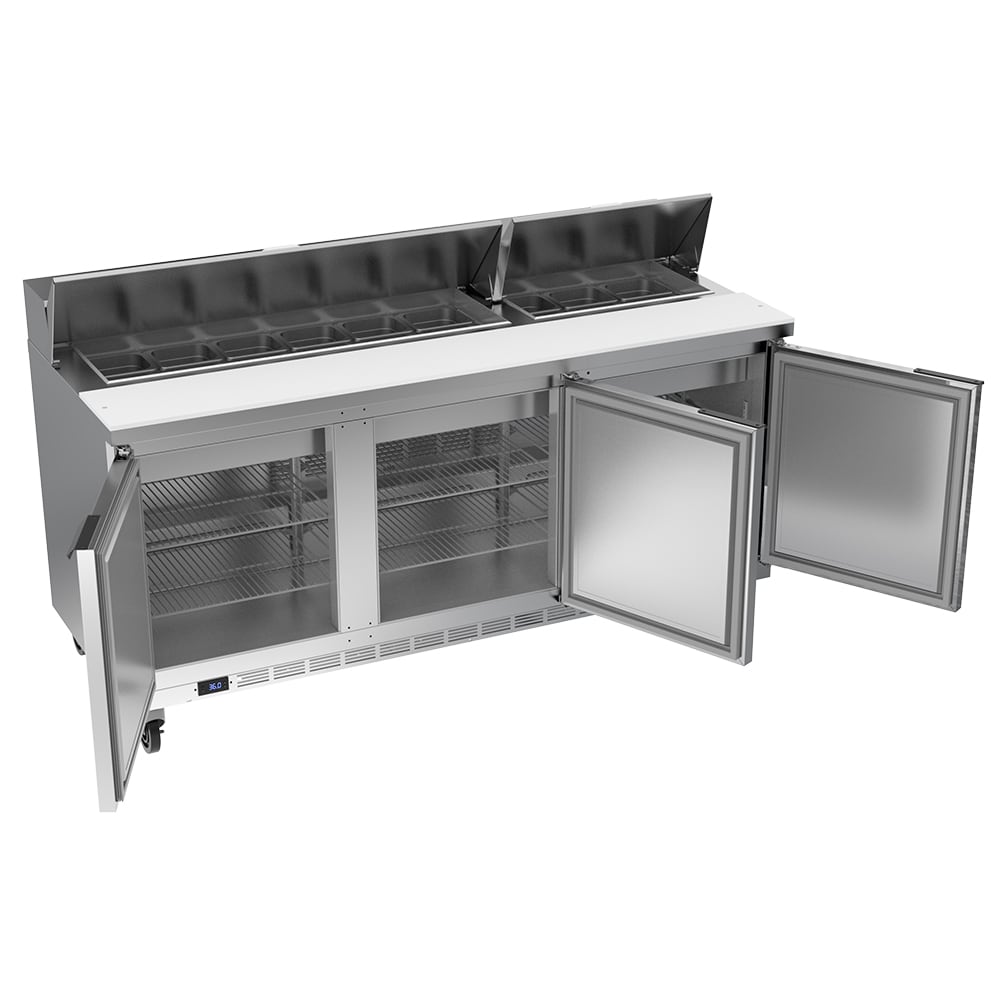 Additional storage space is available in the cabinet on six wire shelves. An epoxy coating on the shelves provides corrosion resistance and durability. R290 hydrocarbon refrigerant is used to produce cold temperatures in the Beverage Air SPE72HC-18 prep table. Its self-contained, rear-mounted refrigeration system can be installed easily.