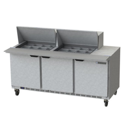 Elite Series Mega Top Refrigerated Counter, three-section, 72″W, 21.5 cu. ft. capacity, (3) doors, stainless steel top with opening for (24) 1/6 size pans, 10″ cutting board & available counter space, (6) shelves, stainless steel exterior top, front, sides & doors, galvanized steel exterior bottom and back, aluminum interior, rear-mounted self-contained refrigeration, (pans furnished are 4″ deep, tops will accommodate 6″ deep pans), R290 Hydrocarbon refrigerant, 1/3 HP, UL, cULus, UL EPH Classified, UL-Sanitation, MADE IN USA