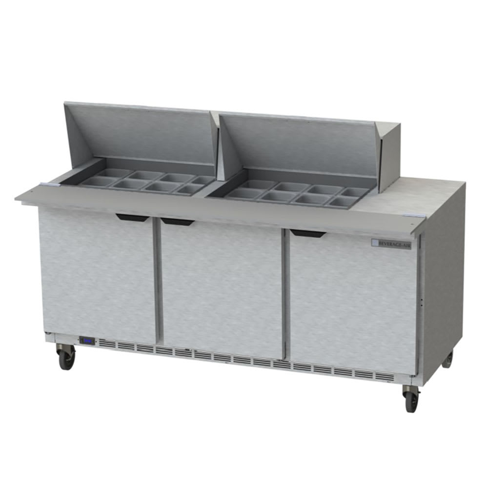 The Beverage Air SPE72HC-24M Elite Series prep table includes 24 sixth-size, 4-inch-deep food pans that are kept below 41 degrees Fahrenheit. It is mostly made of stainless steel with an aluminum-lined interior that resists scuffs, dents, and corrosion. Featuring magnetic gaskets that seal in cold air, the three self-closing doors can open 120 degrees for full access to the cabinet. Recessed aluminum handles are built into the doors to save kitchen space. Its refrigerated base holds food between 36 and 38 degrees Fahrenheit on six shelves. The Beverage Air SPE72HC-24M prep table has a 10-inch-wide polyethylene cutting board that provides space for assembling salads and sandwiches. For mobility, four 6-inch casters are featured with two brakes for safety.