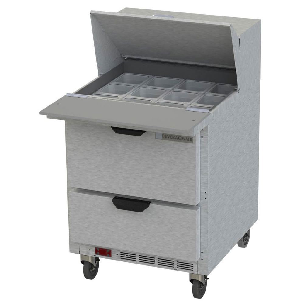 To ensure product is kept in the safe temperature zone, R290 hydrocarbon refrigerant maintains cool temperatures. Forced air is circulated throughout the cabinet to ensure all product is chilled evenly. Since the Beverage Air SPED27HC-12M-B prep table has a rear-mount refrigeration system, it is easy to access, especially with the 6-inch casters on the unit.