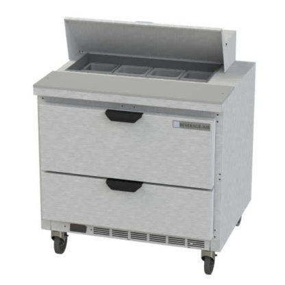 The Beverage Air SPED32HC-08-2 sandwich and salad prep table is a good choice for operators who want to add cold storage without sacrificing valuable prep space. Designed with 8 cubic feet of interior space, this unit has a refrigerated base with two drawers, and each drawer can hold pans as deep as 6 inches.