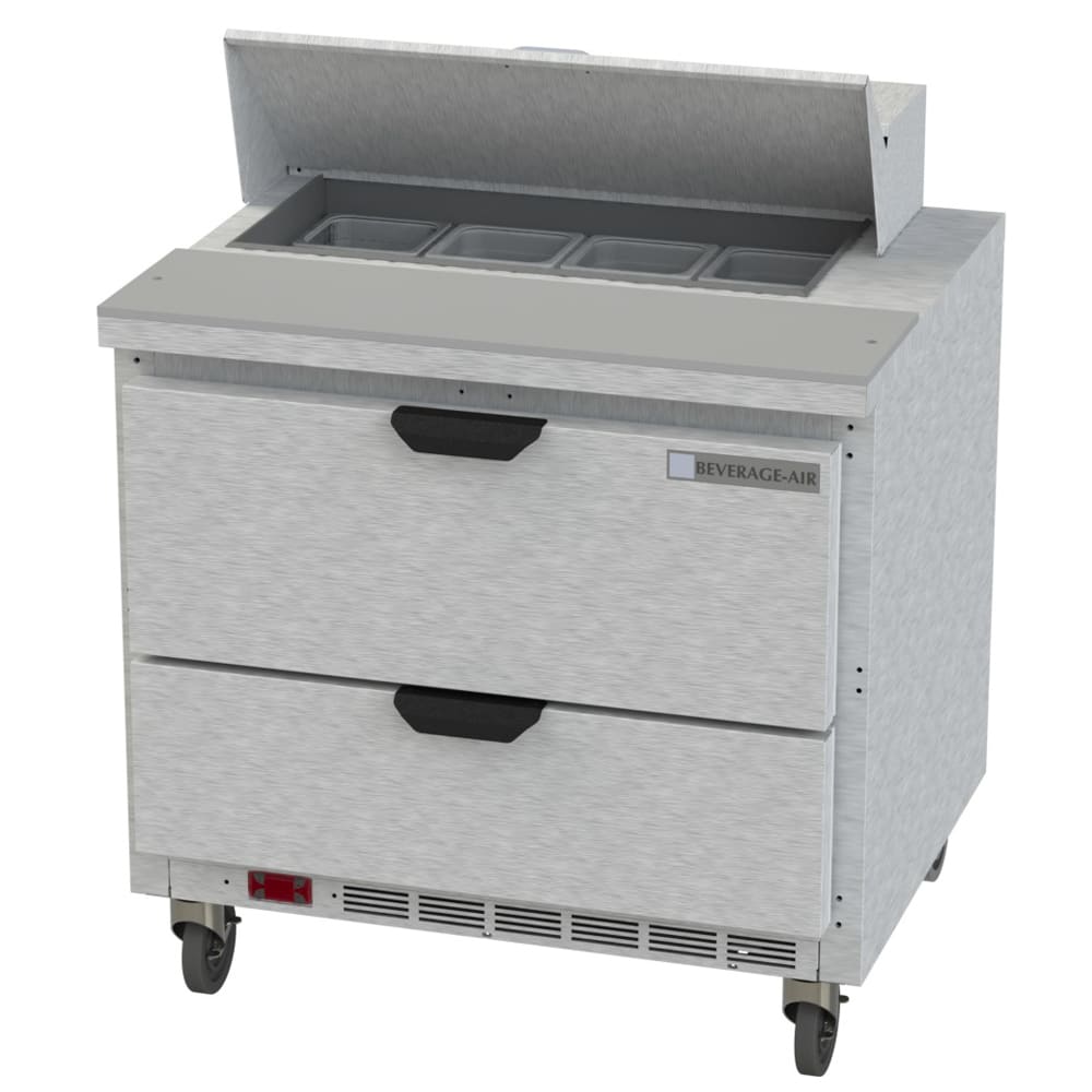 Elite Series Sandwich Top Refrigerated Counter, one-section, 36″W, 7.3 cu. ft., (2) drawers (upper & lower pull-out drawers accommodate 6″ deep pans), stainless steel top with opening for (8) 1/6 size pans (pans furnished are 4″ deep, tops will accommodate 6″ deep pans), 10″ polyethylene cutting board, stainless steel exterior, aluminum interior, rear-mounted self-contained refrigeration, R290 Hydrocarbon refrigerant, 1/6 HP, 115v/60/1, 5.0 amps, plug, UL, cUL, UL EPH, MADE IN USA, 115v/60/1ph
