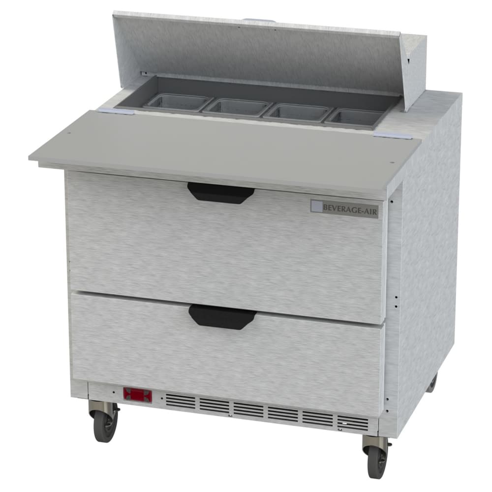 The Beverage Air SPED36HC-08C-2 prep table has a 10-inch-deep polyethylene cutting board that runs the length of the cabinet, making it easy to slide sandwiches, pizzas, and other dishes down while adding toppings. There is a cutout in the top of the unit that holds the eight sixth-size polycarbonate pans that keep toppings chilled until ready to use. Extra toppings can be stored in 6-inch-deep pans in the two pull-out drawers. To ensure all products are evenly chilled, the Beverage Air SPED36HC-08C-2 prep table uses R290 hydrocarbon refrigerant.
