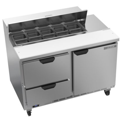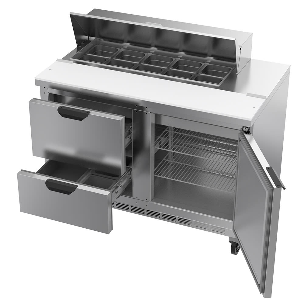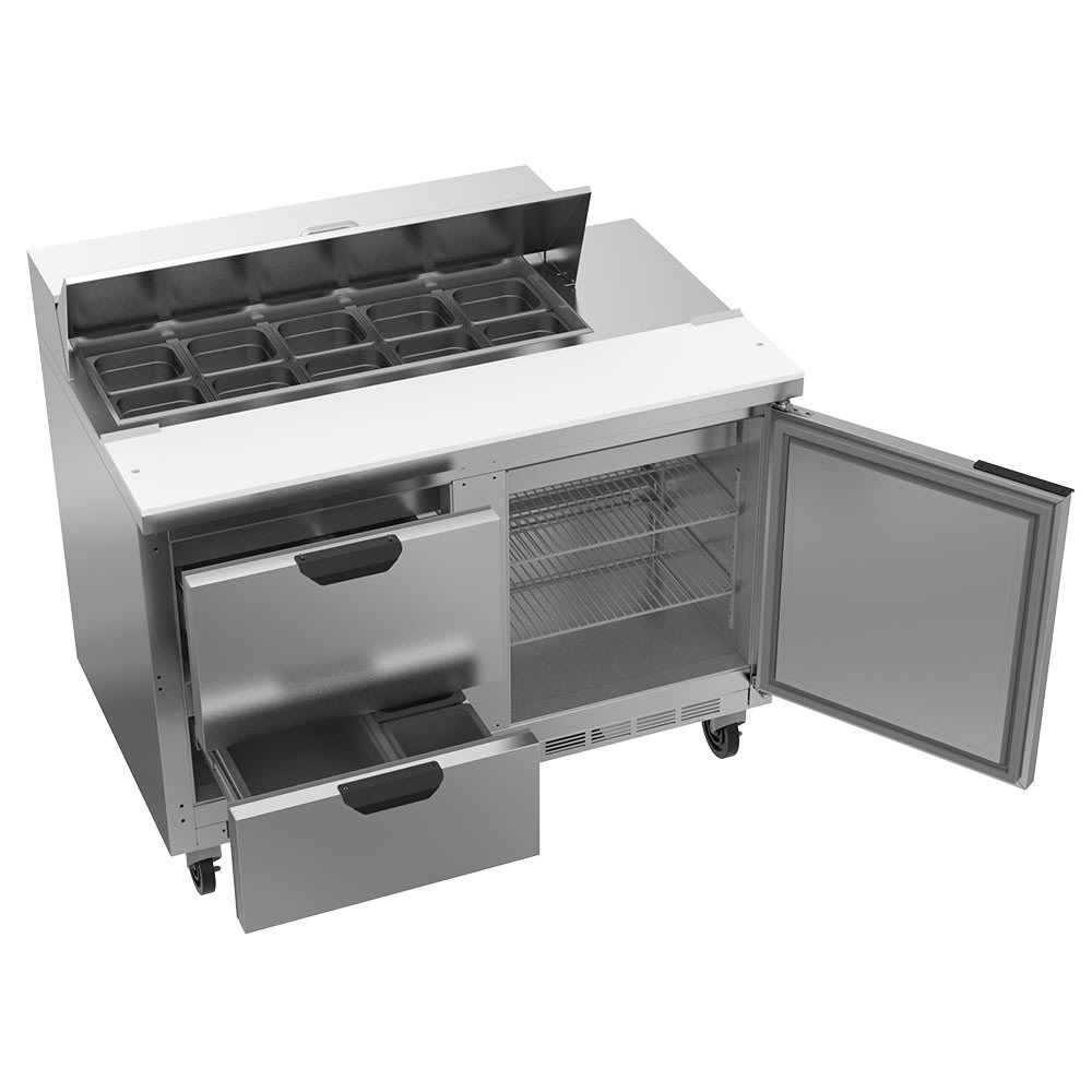 Elite Series Sandwich Top Refrigerated Counter, two-section, 48″W, 9.8 cu. ft., (2) drawers (upper & lower pull-out drawers accommodate 6″ deep pans), (1) door, stainless steel top with opening for (10) 1/6 size pans (pans furnished are 4″ deep, tops will accommodate 6″ deep pans), 10″ polyethylene cutting board, stainless steel exterior, aluminum interior, rear-mounted self-contained refrigeration, R290 Hydrocarbon refrigerant, 1/6 HP, UL, cUL, UL EPH, MADE IN USA, 115v/60/1ph