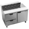 R290 hydrocarbon refrigerant is used to produce cold temperatures in the unit. Its refrigeration system is easy to service from the rear. The Beverage Air SPED48HC-10-2 prep table has a stainless and galvanized steel exterior, so it is heavy duty and corrosion resistant. Its interior cabinet is made of aluminum for durability in commercial applications. Moving the table is easy thanks to the 6-inch casters, but it can be kept in place since two of the casters can be locked.