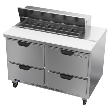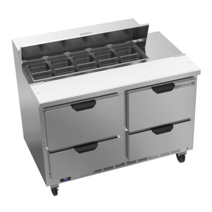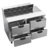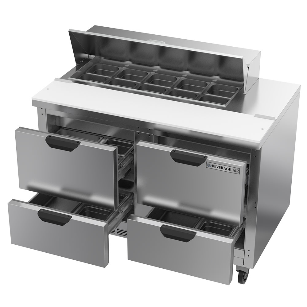 The four pull-out drawers can be used for additional storage. They have stainless steel frames and telescoping, locking slides which prevent the drawers from being accidently removed from the cabinet. The Beverage Air SPED60HC-08C-2 prep table uses R290 hydrocarbon refrigerant to maintain cold temperatures.