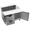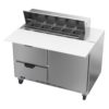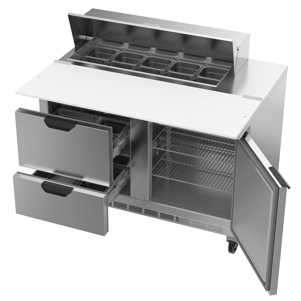 The Beverage Air SPED48HC-10C-2 prep table holds 10 sixth-size, 4-inch-deep pans in its top compartment. Additional storage is offered in the door compartment and two pull-out drawers. Both the top compartment and pull-out drawers can accommodate pans that are 6 inches deep. Cold temperatures in the unit are maintained by R290 hydrocarbon refrigerant, and the refrigeration system is serviceable from the rear. Since the interior is made of aluminum, it is heavy duty, and the Beverage Air SPED48HC-10C-2 prep table’s stainless steel exterior is durable for commercial use, and it can be cleaned easily.