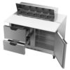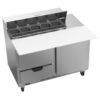 Elite Series Sandwich Top Refrigerated Counter, two-section, 48″W, 9.8 cu. ft., (2) drawers (upper & lower pull-out drawers accommodate 6″ deep pans), (1) door, stainless steel top with opening for (10) 1/6 size pans (pans furnished are 4″ deep, tops will accommodate 6″ deep pans), 17″ polyethylene cutting board, stainless steel exterior, aluminum interior, rear-mounted self-contained refrigeration, R290 Hydrocarbon refrigerant, 1/6 HP, UL, cUL, UL EPH, MADE IN USA, 115v/60/1ph