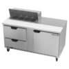 Elite Series Sandwich Top Refrigerated Counter, two-section, 60″W, 17.1 cu. ft. capacity, (2) drawers (upper & lower pull-out drawers accommodate 6″ deep pans), (1) door, (2) shelves, stainless steel top with opening for (8) 1/6 size pans (pans furnished are 4″ deep, tops will accommodate 6″ deep pans), 10″ polyethylene cutting board, stainless steel exterior with galvanized steel back & bottom, aluminum interior, rear-mounted self-contained refrigeration, R290 Hydrocarbon refrigerant, 1/3 HP, UL, cULus, UL EPH Classified, UL-Sanitation, MADE IN USA