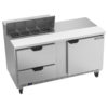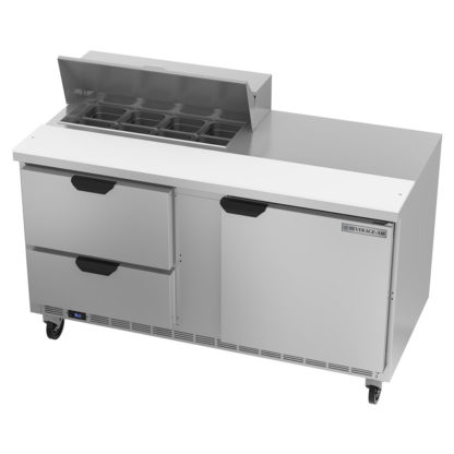 The Beverage Air SPED60HC-08-2 Elite Series prep table has a 10-inch-wide polyethylene cutting board and a stainless steel exterior that resists corrosion and scratches. Its interior is lined with corrosion-resistant aluminum and has a field-reversible door that can stay open 120 degrees or close on its own. Magnetic gaskets snap into place to prevent cold air from escaping. Both drawers are secured on telescoping slides and have a locking mechanism to ensure they are not pulled off. The Beverage Air SPED60HC-08-2 food prep table comes with eight sixth-size food pans that are 4 inches deep. Its two epoxy-coated shelves hold products inside a refrigerated base. To supply a comfortable grip, the drawers and door have recessed aluminum handles. Four 6-inch casters are included for movement.