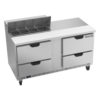 Elite Series Sandwich Top Refrigerated Counter, two-section, 60″W, 12.2 cu. ft., (4) drawers (upper & lower pull-out drawers accommodate 6″ deep pans), stainless steel top with opening for (8) 1/6 size pans (pans furnished are 4″ deep, tops will accommodate 6″ deep pans), 10″ polyethylene cutting board, stainless steel exterior, aluminum interior, rear-mounted self-contained refrigeration, R290 Hydrocarbon refrigerant, 1/4 HP, UL, cUL, UL EPH, MADE IN USA
