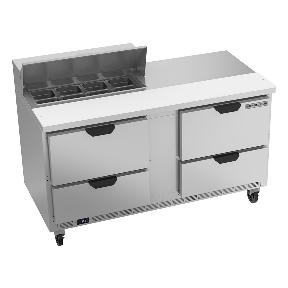 The Beverage Air SPED60HC-08-4 prep table has a galvanized and stainless steel exterior, making it resistant to minor damage. Its interior is lined with aluminum to prevent corrosion. Drawer frames are supported by telescoping slides, and drawers are kept from being pulled out of the cabinet by a locking mechanism. The drawers hold sixth-size polycarbonate pans for convenient, organized storage. A polyethylene cutting board on the front of the unit can be used to prep ingredients.