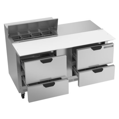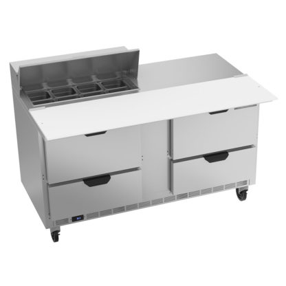 Elite Series Sandwich Top Refrigerated Counter, two-section, 60″W, 12.2 cu. ft., (4) drawers (upper & lower pull-out drawers accommodate 6″ deep pans), stainless steel top with opening for (8) 1/6 size pans (pans furnished are 4″ deep, tops will accommodate 6″ deep pans), 17″ polyethylene cutting board, stainless steel exterior, aluminum interior, rear-mounted self-contained refrigeration, R290 Hydrocarbon refrigerant, 1/4 HP, UL, cUL, UL EPH, MADE IN USA, 115v/60/1ph