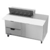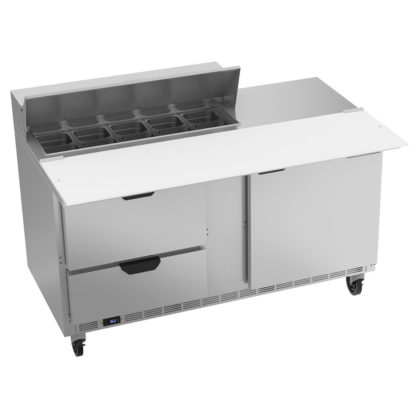 The Beverage Air SPED60HC-10C-2 prep table has two drawers and a door compartment for refrigerated storage, as well as a cutout on top. Pans up to 6 inches deep are accepted in the countertop and drawers. Included are 10 four-inch deep polycarbonate pans that easily fit into the compartments. Its exterior is constructed of stainless steel that is easy to clean and durable. Since the interior is made of aluminum, the interior cabinet is resistant to corrosion.