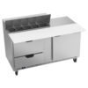 Elite Series Sandwich Top Refrigerated Counter, two-section, 60″W, 12.2 cu. ft., (2) drawers (upper & lower pull-out drawers accommodate 6″ deep pans), (1) door, stainless steel top with opening for (10) 1/6 size pans (pans furnished are 4″ deep, tops will accommodate 6″ deep pans), 17″ polyethylene cutting board, stainless steel exterior, aluminum interior, rear-mounted self-contained refrigeration, R290 Hydrocarbon refrigerant, 1/3 HP, UL, cUL, UL EPH, MADE IN USA, 115v/60/1ph