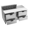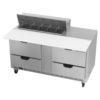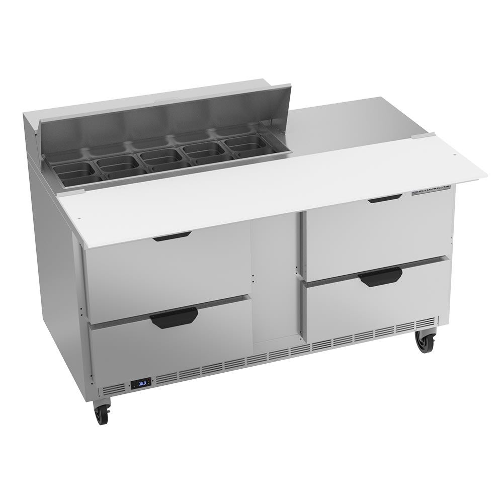 The Beverage Air SPED60HC-10C-4 prep table has an open countertop section that holds 10 sixth-size polycarbonate pans. All four drawers have stainless steel frames and telescoping slides to create a rugged, long-lasting design. Most of the exterior is made of stainless steel for durability and ease of cleaning. Since the interior is lined with aluminum, it is corrosion resistant. Its rear-mounted refrigeration system allows equipment to be placed on the left or right of the cabinet without blocking airflow. Toppings in the compartment cutout are surrounded by forced air, ensuring there are no hot or cold spots. Cold temperatures are produced by R290 hydrocarbon refrigerant. The Beverage Air SPED60HC-10C-4 prep table has epoxy-coated evaporator coils.