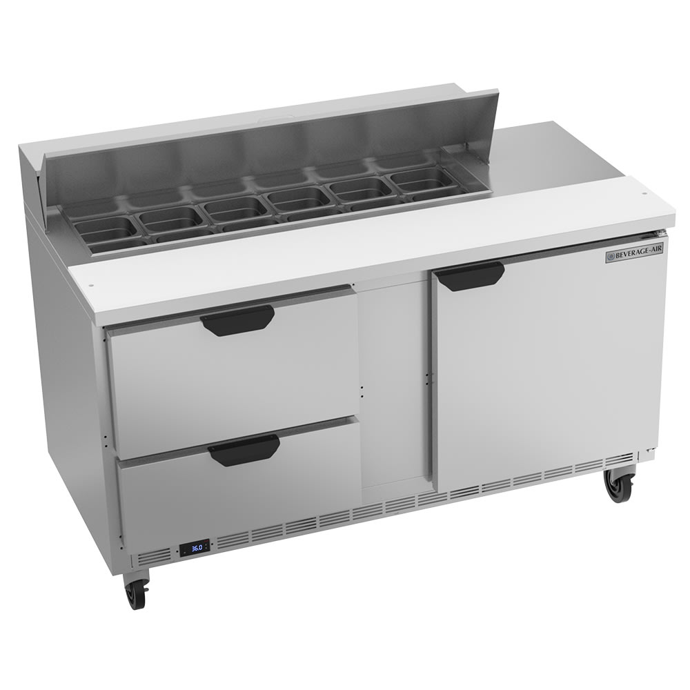 The Beverage Air SPED60HC-12-2 prep table has a damage-resistant stainless steel exterior that is easy to clean. It features a single door compartment and two pull-out drawers to hold toppings and other product. In the top compartment, 12 sixth-size polycarbonate pans hold lettuce, tomato, cheese, and more. A polyethylene cutting board can be used to prep toppings or prepare pizzas, sandwiches, or salads.