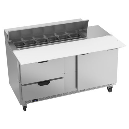 Elite Series Sandwich Top Refrigerated Counter, two-section, 60″W, 12.2 cu. ft., (2) drawers (upper & lower pull-out drawers accommodate 6″ deep pans), (1) door, stainless steel top with openings for (12) 1/6 size pans (pans furnished are 4″ deep, tops will accommodate 6″ deep pans), 17″ polyethylene cutting board, stainless steel exterior, aluminum interior, rear-mounted self-contained refrigeration, R290 Hydrocarbon refrigerant, 1/4 HP, UL, cUL, UL EPH, MADE IN USA, 115v/60/1ph