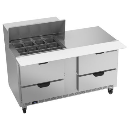 The Beverage Air SPED60HC-12M-4 prep table has a rear-mounted refrigerated system that can be easily accessed through the back for maintenance. Eco-friendly R290 hydrocarbon refrigerant is used to provide cool temperatures. The evaporator uses forced air under pans to evenly circulate cold temperatures. An epoxy coating on the evaporator coil resists corrosion.