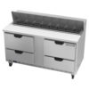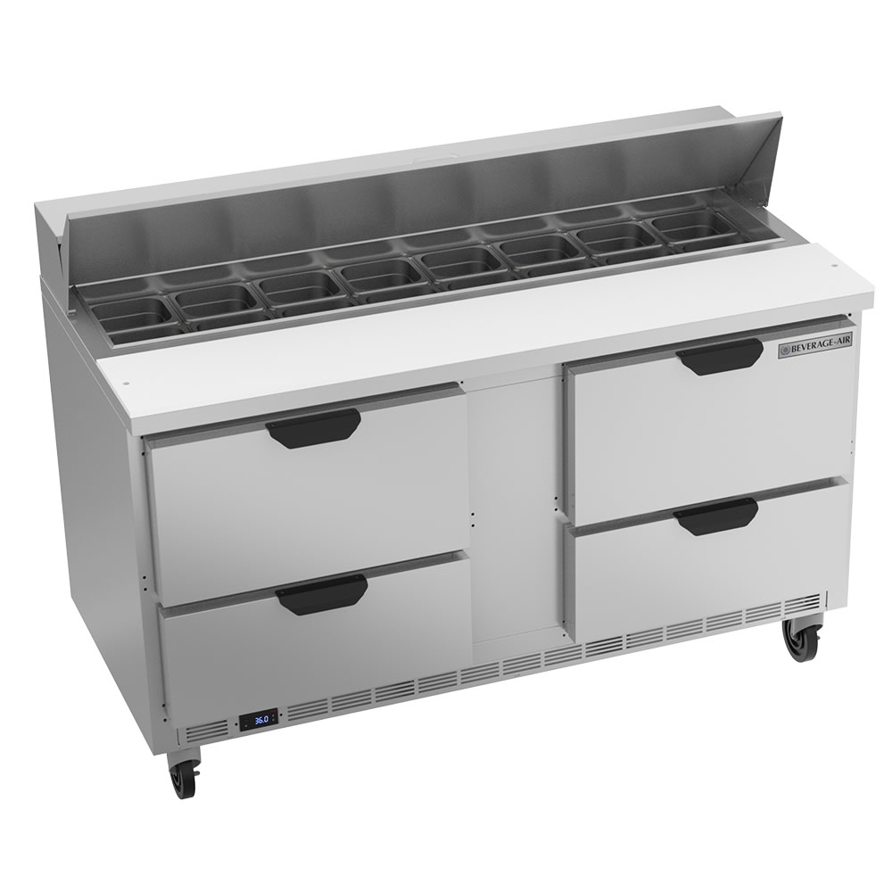 The Beverage Air SPED60HC-16-4 prep table uses environmentally friendly R290 hydrocarbon refrigerant to provide cold temperatures. Its evaporator forces air below pans, in the drawers, and throughout the entire cabinet, ensuring products stay cold. Its evaporator coil has an epoxy coating that resists corrosion. Since the refrigeration system is mounted in the rear, it can be serviced easily.