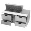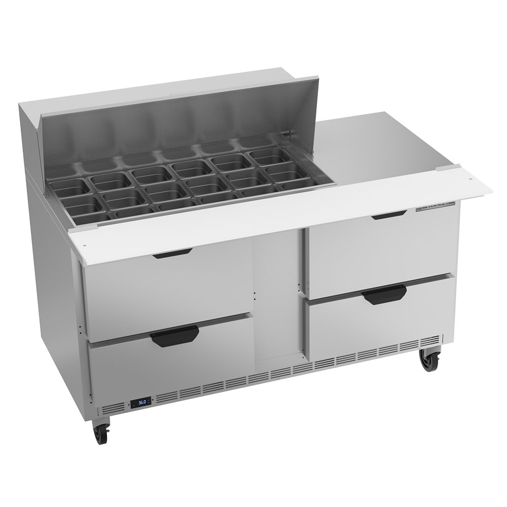 The Beverage Air SPED60HC-18M-4 prep table has a countertop opening that holds 18 sixth-size, 4-inch-deep pans. Toppings for pizza, sandwiches, and salads are held in these pans in the cutout. The stainless steel exterior of the unit is durable and withstands commercial use. The interior has an aluminum lining to resist corrosion. A 10-inch-deep polyethylene cutting board is mounted on the front and is useful for preparing ingredients and main dishes. There are four drawers in the front that each hold 6-inch-deep pans for extra topping storage. The Beverage Air SPED60HC-18M-4 prep table has a rear-mounted refrigeration system, enabling the unit to sit next to walls or equipment without hindering the airflow. R290 hydrocarbon refrigerant is used to keep internal temperatures cool.