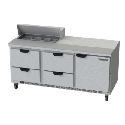 The Beverage Air SPED72HC-08-4 prep table has a stainless steel exterior that is easy to clean and heavy duty for regular use. Corrosion is resisted in the interior due to its aluminum lining. Its self-contained refrigeration system is mounted in the rear, keeping it safe from spills and floor debris. The system uses eco-friendly R290 hydrocarbon refrigerant to provide cool temperatures. The top compartment holds the eight sixth-size, 6-inch-deep pans. Product can be prepared on the durable polyethylene cutting board. The Beverage Air SPED72HC-08-4 prep table features four pull-out drawer compartments to hold additional toppings in 6-inch-deep sixth-size pans. Additional refrigerated storage is provided by the door compartment.
