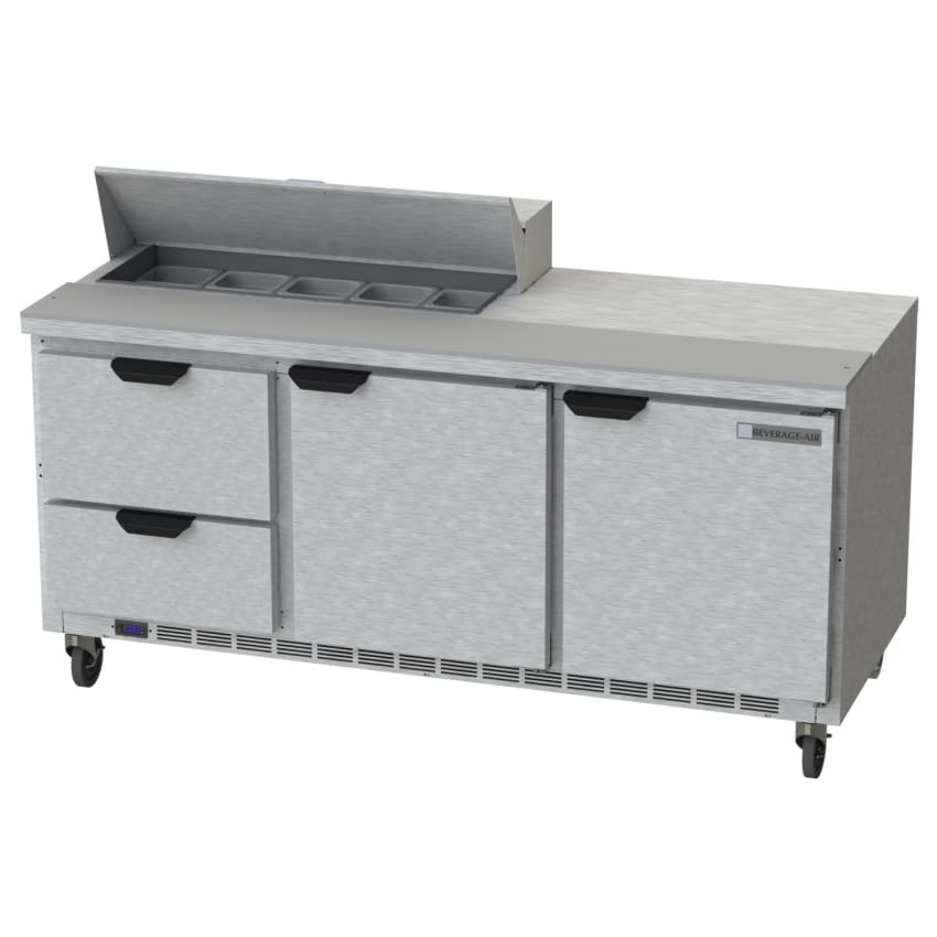 The Beverage Air SPED72HC-10-2 prep table has a stainless steel exterior with an aluminum interior that resists corrosion. On top, the cutout sections accommodate 10 sixth-size pans where toppings for pizza, sandwiches, and salads are stored. Two pull-out drawer compartments in the cabinet base accommodate 6-inch-deep pans so they can be switched with the ones stored in the top. There are also two door compartments for storage of meat, cheese, produce, and more. A 10-inch-deep polyethylene cutting board acts as a prep place for making sandwiches, topping salads, and more. The refrigeration system is self-contained, making service and installation easy. Since the refrigeration system is rear mounted, the Beverage Air SPED72HC-10-2 prep table is protected from damage from spills, flour, dust, and more.