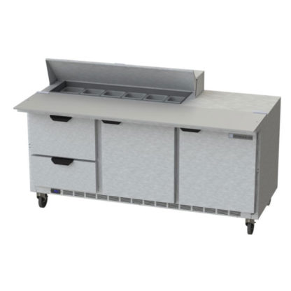 The Beverage Air SPED72HC-12C-2 prep table comes with 12 sixth-size, 4-inch-deep pans in its top compartment. Forced air from the evaporator is used to chill the pans from below, providing even and effective cooling. Its hood and lid assembly are designed to keep cold air inside the compartment while shielding food in the pans from contamination. The removable 17-inch-deep cutting board provides plenty of space for prepping ingredients and adding ingredients to sandwiches and salads.