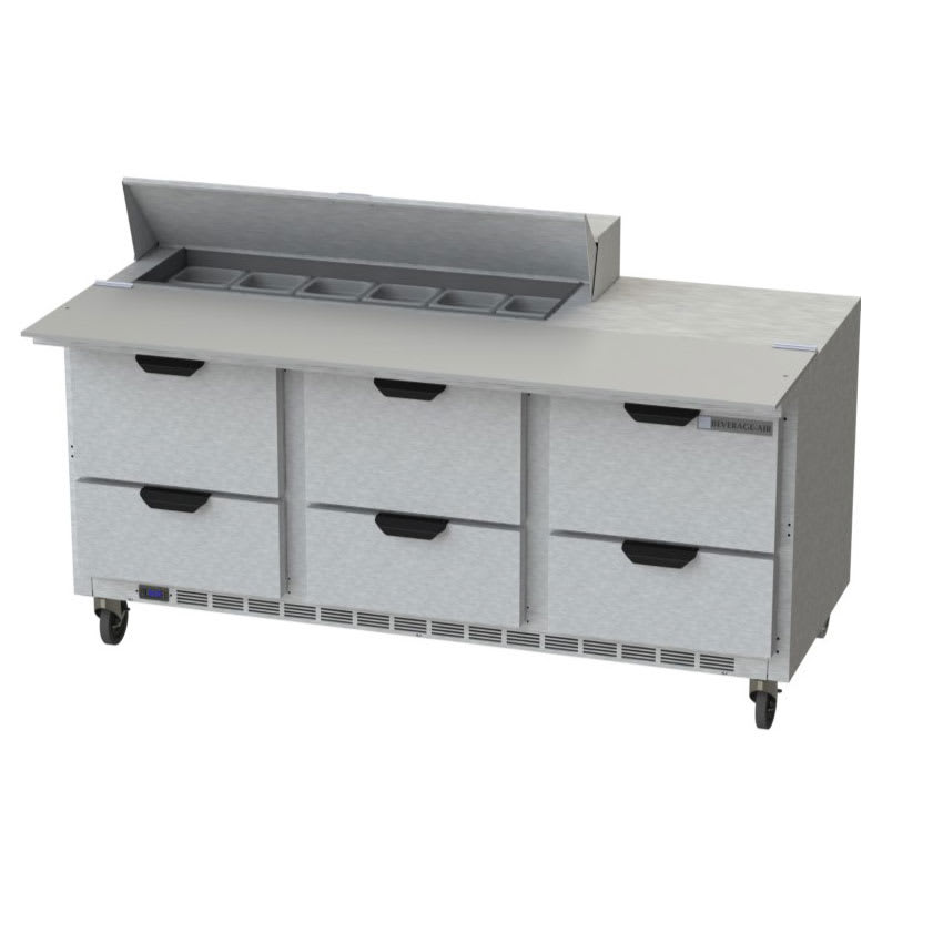 The Beverage Air SPED72HC-12C-6 prep table has six pull-out drawers in the front that hold 6-inch-deep pans. Telescoping slides are included for supporting the stainless steel drawer frames. Locks on these slides are designed to prevent the drawers from being accidentally pulled out of the cabinet. A 17-inch-deep cutting board spans the front of the unit, so staff can conveniently prep ingredients or finish salads and sandwiches. Users can move the unit with the 6-inch casters, two of which have brakes to keep the unit still when needed.