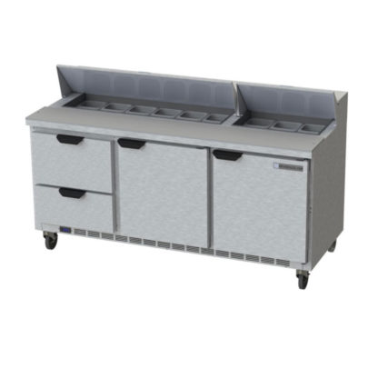 The Beverage Air SPED72HC-18-2 prep table has two drawers with stainless steel frames for durability. The frames are supported by telescoping slides that can lock to restrict the drawers from being accidentally removed from the cabinet. Both drawers can hold 6-inch-deep pans, which are sold separately. There are two door compartments for extra storage, which have two corrosion-resistant shelves each. The door has a self-closing design, and it stays open past 120 degrees for product stocking and cabinet cleaning. The unit is easy to move with the 6-inch casters; for locking in place, two of the casters have brakes.
