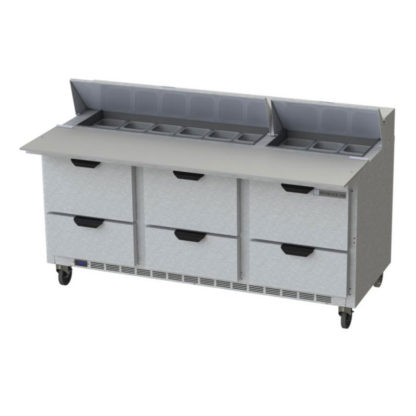 Pans measuring 6 inches deep are accepted by the six pull-out drawers in the front. The drawers’ frames are made of strong stainless steel. The telescoping slides lock to prevent the drawers from being accidentally jerked out of the cabinet. The Beverage Air SPED72HC-18C-6 prep table’s exterior is constructed of heavy-duty stainless steel and galvanized steel. An aluminum lining helps prevent corrosion on the interior. The rear-mounted refrigeration system is protected from debris and spills that can cause damage. R290 hydrocarbon refrigerant is used by the system to produce the cold temperatures.