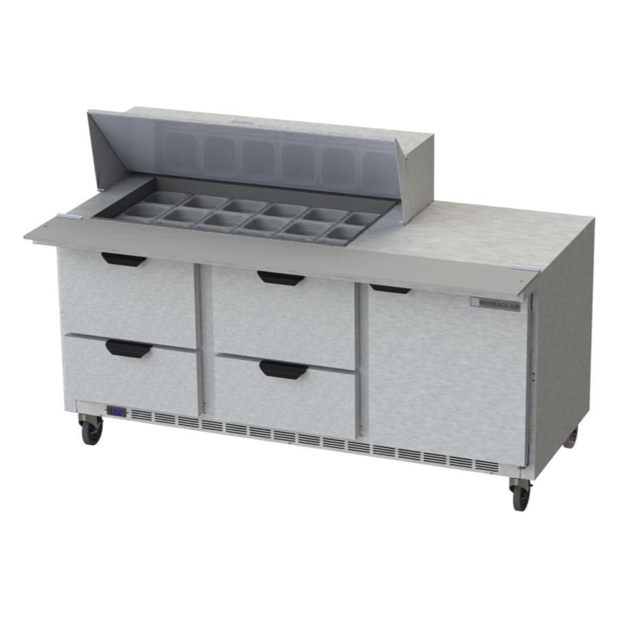 The Beverage Air SPED72HC-18M-4 prep table holds 18 sixth-size pans in its countertop opening. The four pull-out drawers and door section can also be used to store more pans and product. Since the exterior is constructed of stainless steel, it is damage resistant and easy to clean, and its aluminum interior resists corrosion. Since the refrigeration system is mounted in the back, it can be installed next to other equipment without affecting airflow. For ideal energy efficiency, R290 hydrocarbon refrigerant cools temperatures. The Beverage Air SPED72HC-18M-4 prep table has a polyethylene cutting board that is sturdy and removable to simplify cleaning.