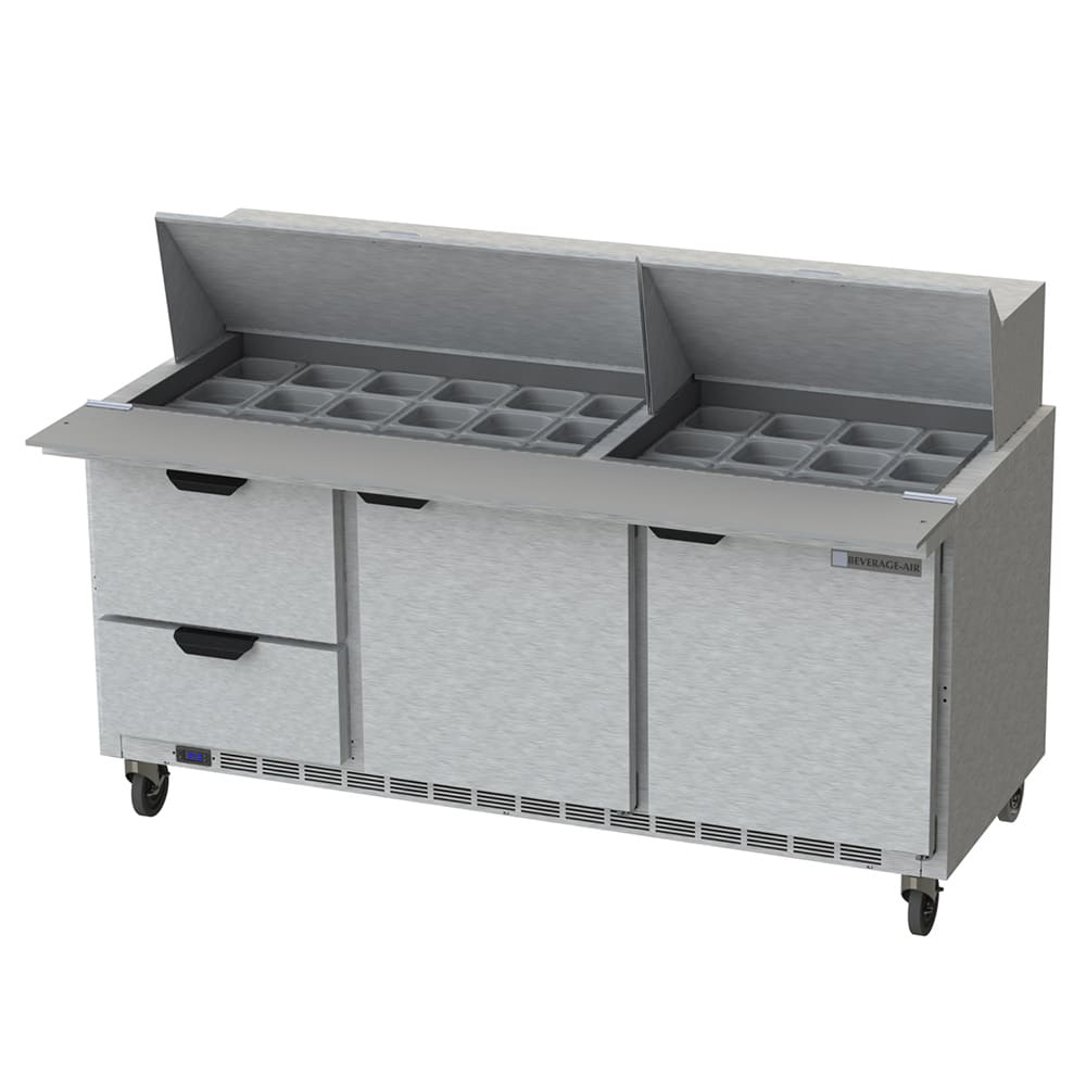 The Beverage Air SPED72HC-30M-2 prep table has a stainless steel exterior and an aluminum-lined interior that resists corrosion. Its two self-closing doors can stay open beyond 120 degrees, while its two drawers can accommodate 6-inch-deep food pans and feature frames and telescoping slides to prevent them from sliding off the cabinet. Four epoxy-coated shelves can hold additional ingredients, and a 10-inch-wide cutting board is included for prepping salads and sandwiches. The Beverage Air SPED72HC-30M-2 prep table has four 6-inch casters with two brakes. This table comes with (30) 4-inch-deep, sixth-size food pans.