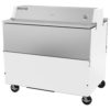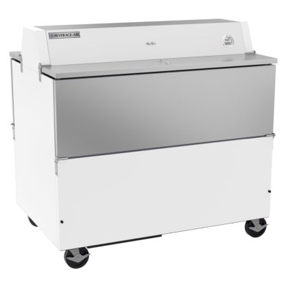 School Milk Cooler, forced air, 49″W x 34″D x 47-3/4″H, 24.3 cu. ft., dual access, exterior digital thermometer, full electronic control, flat top carton capacities, (12) 13″ x 13″ x 11″ or (8) 19″ x 13″ x 11 case capacities, self-latching doors/lids with safety bumpers, cylinder lock, epoxy coated steel wire floor racks, electronic control, auto defrost, white exterior, stainless steel interior, floor drain, R290 Hydrocarbon refrigerant, 1/3 HP, cULus, UL EPH Classified, UL-Sanitation, Made in USA