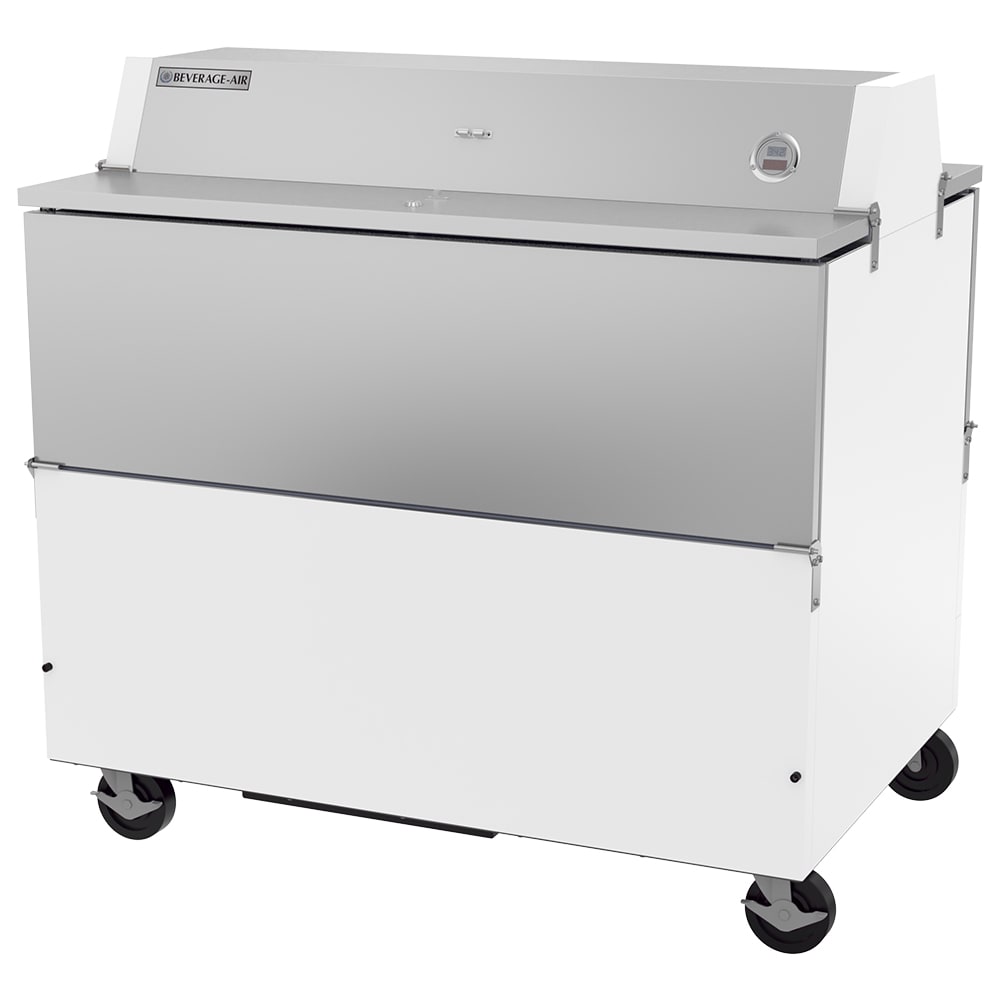 For balanced cooling, the Beverage Air STF49HC-1-W-02 school milk cooler has a forced-air refrigeration system that circulates cold air around the interior. It keeps milk chilled to a level between 36 and 38 degrees Fahrenheit. Employees can ensure that the cooler is operating properly by checking the temperature on the external digital thermometer.