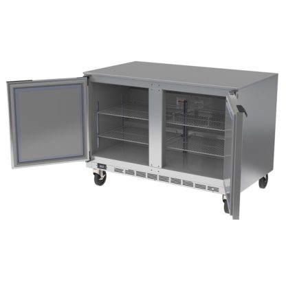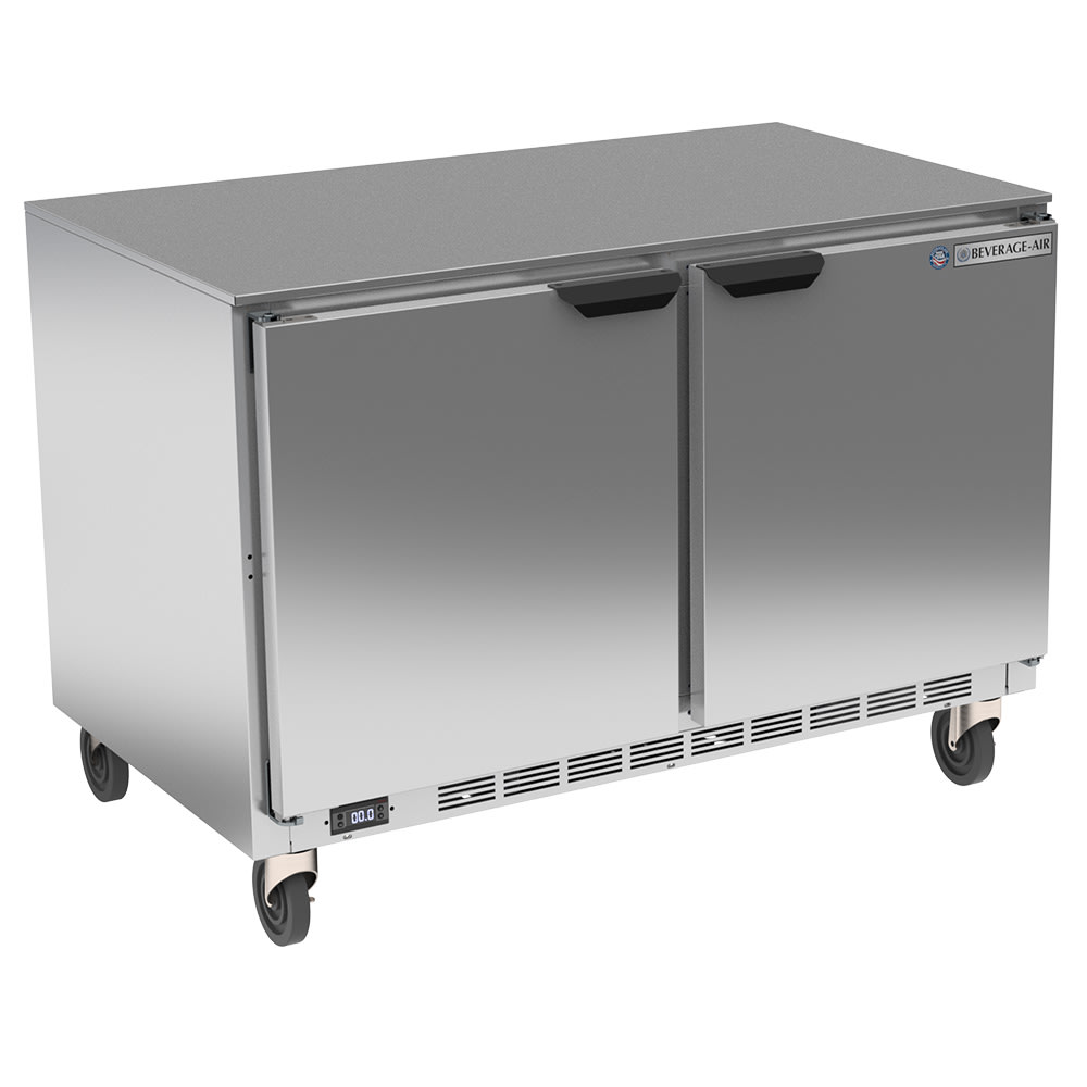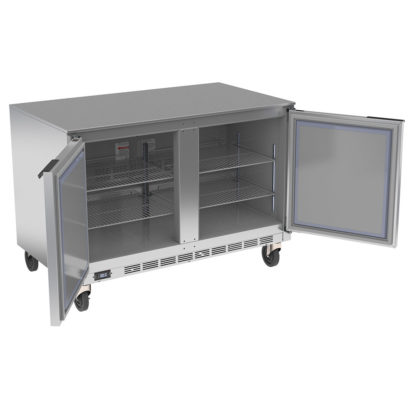 The Beverage-Air UCF48AHC commercial undercounter freezer’s four wire shelves are coated in epoxy to extend their service life. Operators can reverse this unit’s doors to accommodate different arrangements, and the undercounter freezer holds temperatures at or below 0 degrees Fahrenheit for optimal product preservation. To promote eco-friendless, this unit runs on R290 refrigerant. Its automatic defrost lowers employee labor and its epoxy-coated evaporator withstands extreme temperatures. Overall, the undercounter freezer measures 48 inches wide by 32 inches deep by 345/8 inches tall.