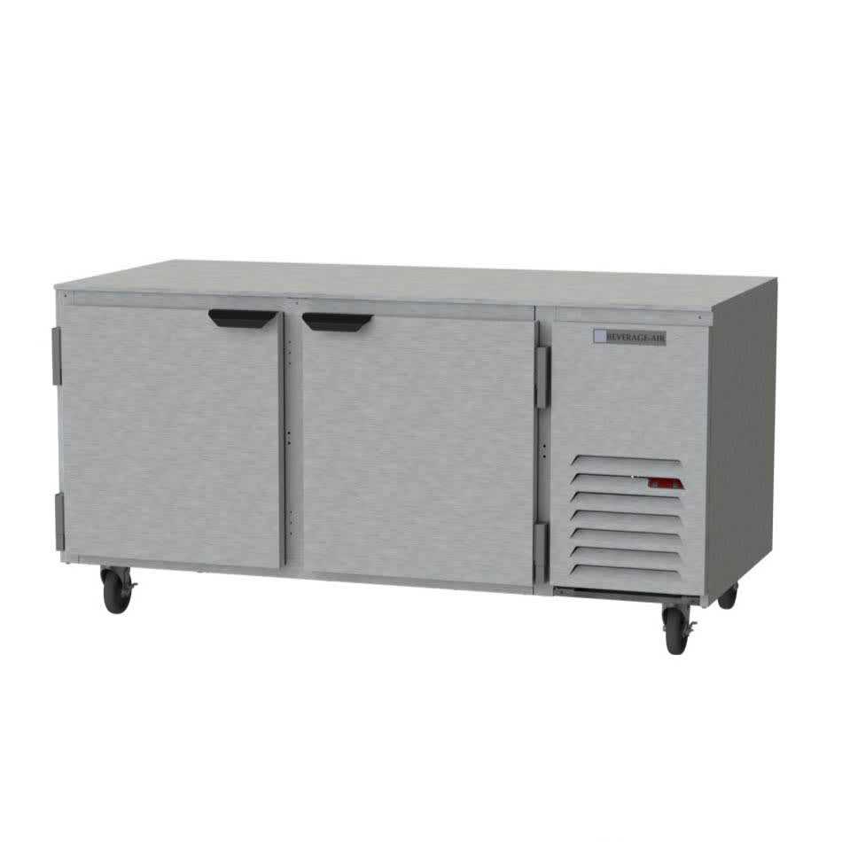 To facilitate transportation for cleaning and servicing, the Beverage Air UCF67AHC two-section freezer is mounted on 6-inch casters. It has two sections and offers 20.08 cubic feet of interior space. Each section is accessible behind a solid door that can be reversed in the field to fit into different layouts. Protecting against corrosion with frequent exposure to moisture, its interior is constructed of aluminum.