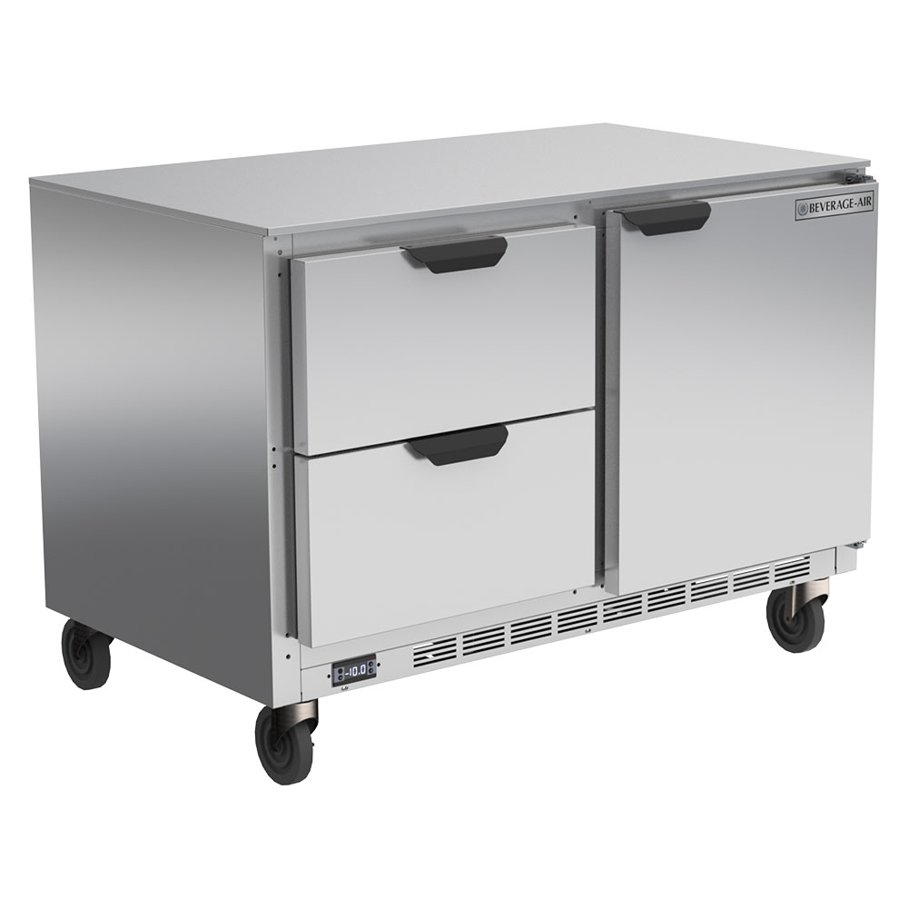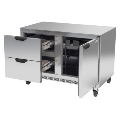 Undercounter Freezer, two-section, 48″W, 13.9 cu. ft., (2) drawers & (1) door, (2) shelves, stainless steel exterior & top, aluminum interior, rear-mounted self-contained refrigeration, R290 Hydrocarbon refrigerant, 1/2 HP, cULus, UL EPH Classified, UL-Sanitation, MADE IN USA