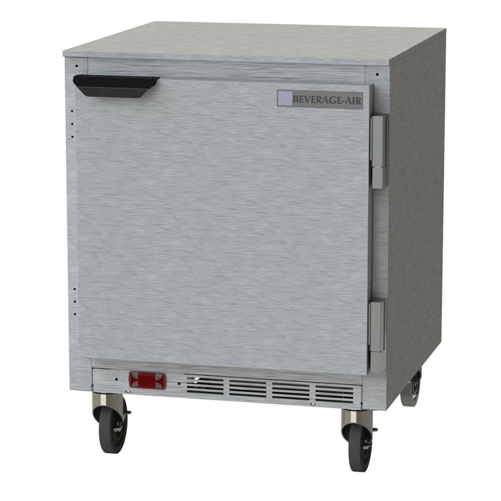 The Beverage Air UCR27HC undercounter refrigerator has a stainless steel exterior top, door, front, and sides and a galvanized steel back and bottom for strength in commercial settings. Its insulated sub-top is designed to resist heat from nearby countertop equipment. The interior has a corrosion-resistant aluminum lining that makes it simple to clean up messes.