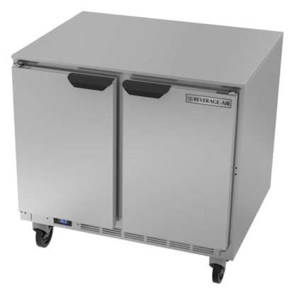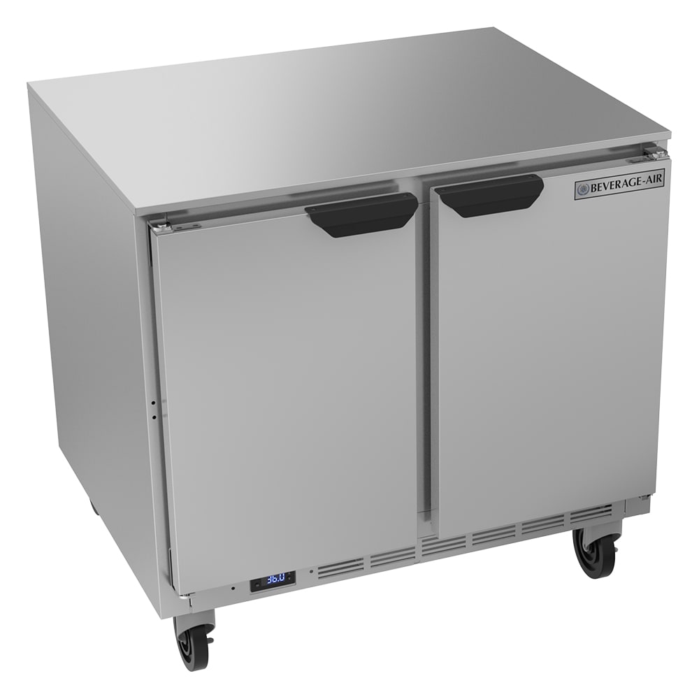 The Beverage Air UCR36AHC undercounter refrigerator has an exterior that is made of heavy-duty stainless and galvanized steel for durability. Inside the aluminum-lined cabinet, there are two coated steel wire shelves that hold products. Its 1/2-inch-thick sub top is ideal for under-counter use since it protects the cabinet from heat generated by countertop equipment. The stainless steel door has a self-closing design to keep cool air inside the unit.