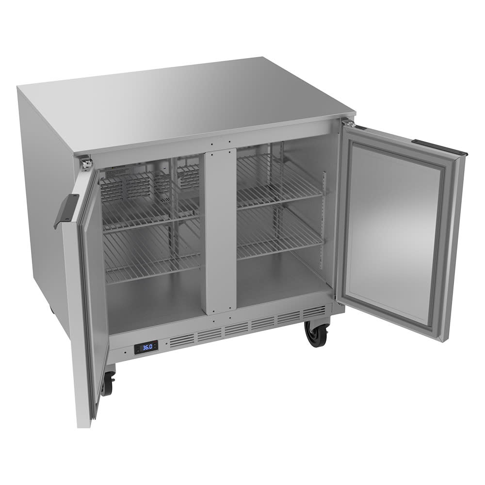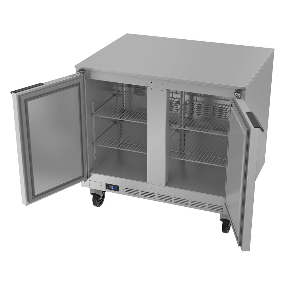 Undercounter Refrigerator, two-section, 36″W, 8.5 cu. ft., (2) doors, (4) shelves, stainless steel exterior & top, aluminum interior, rear-mounted self-contained refrigeration, R290 Hydrocarbon refrigerant, 1/6 HP, UL, cULus, UL EPH Classified, UL-Sanitation, MADE IN USA, 115v/60/1ph
