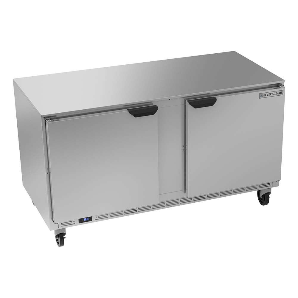 Undercounter Refrigerator, two-section, 60″W, 14.75 cu. ft., (2) doors, (4) shelves, stainless steel exterior & top, aluminum interior, rear-mounted self-contained refrigeration, R290 Hydrocarbon refrigerant, 1/5 HP, UL, cULus, UL EPH Classified, UL-Sanitation, MADE IN USA, 115v/60/1ph