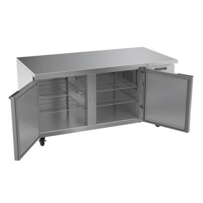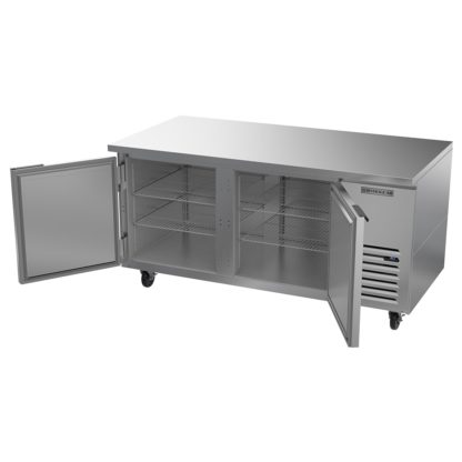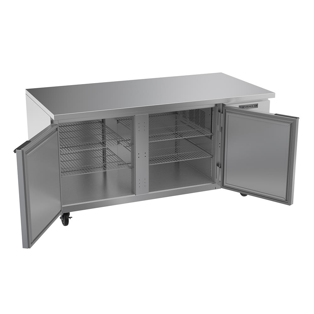 To effectively seal in cold air, the Beverage Air UCR67AHC two-section refrigerator features two field-reversible doors with magnetic door gaskets. It cools using R290 hydrocarbon refrigerant, an environmentally friendly hydrocarbon, and includes an epoxy-coated evaporator coil. For mobility, this unit is mounted on casters.